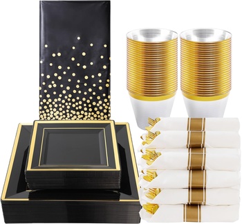مجموعة أدوات مائدة لحفلات العشاء مع حافة ذهبية للاستعمال مرة واحدة